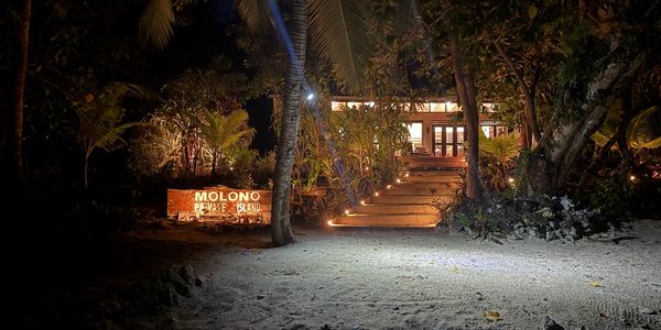 Molono Island is four and a half acres, or almost two hectares. Walk anywhere on the island on manicured trails through gardens of flowers, palms and tropical fruits. Roam through our natural forest and find patches of native coconut trees, banyan trees, and ancient hardwoods. Every effort has been made to preserve the gorgeous bird habitats here, and we commonly have colorful avian visitors from the mainland flitting in the trees above.